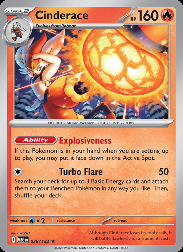 Dankzij het type Fire en de Rare zeldzaamheid kan Cinderace (028) een belangrijke rol spelen in uiteenlopende deckstrategieën. Spelers die hun deck slim opbouwen, combineren deze kaart vaak met ondersteunende trainers, energiekaarten en andere Pokémon uit Mega Evolution. Zo ontstaat een deck waarmee je tegenstanders onder druk zet en tegelijkertijd controle houdt over het spelverloop. Door verschillende lijsten te testen, ontdek je al snel welke combinaties rond deze Pokémon kaart het beste bij jouw speelstijl passen. Zo haal je zowel competitief als casual het maximale uit Cinderace.